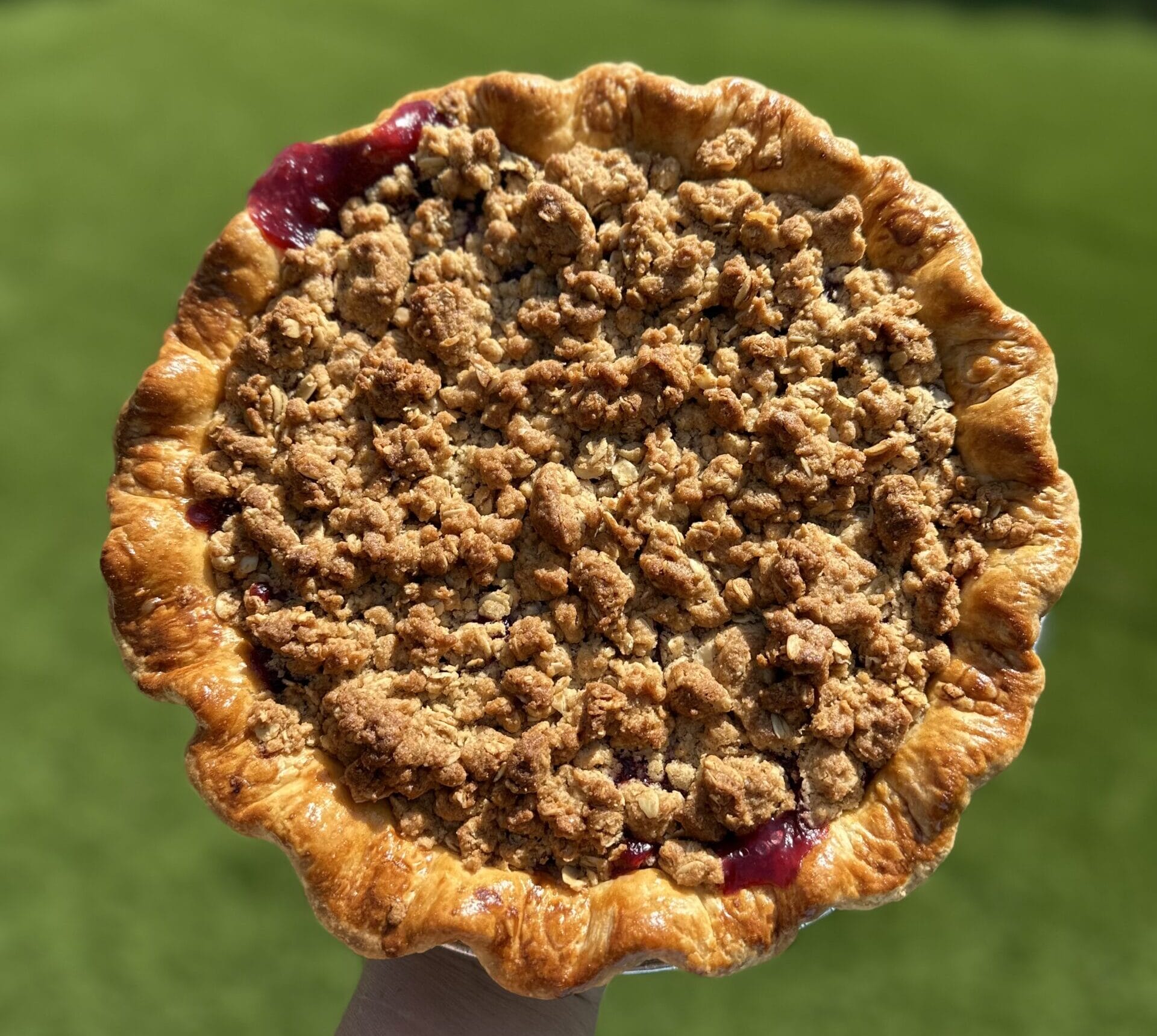 Well-balanced in sweetness and tartness, our classic cherry pie is topped with an oatmeal crumble in an all-butter flaky crust.